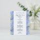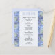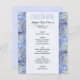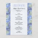 modelo de cardápio de barato de casamento ou de almoço chá de panela com borda de flor azul pálida de hydrangea. Papel menor, 4 x 5 polegadas, é barato e bonito. Personalize facilmente o título em azul-piscadela e o texto preto restante com todos os itens do menu.