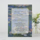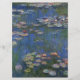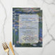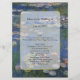 Grande cardápio de mesa de casamento feito com a pintura de arte de Monet chamada Lírios d'Água como fundo. Os gráficos de uma delicada estrutura de tom de ouro circundam a área de texto do menu. Personalize todo o texto para se adequar ao menu de recepção de casamento.