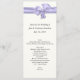 Menu de mesa de casamento longo e magro, feito em marfim com gráficos elegantes de uma fita de cetim e arco de lavanda, no topo do menu. Personalize todo o texto para se adequar ao menu de recepção de casamento.