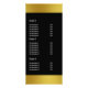 Frente: No topo, esta placa de rack elegante tem texto preto para o nome do restaurante em uma falso faixa dourada. Abaixo, o texto branco diz 'Menu'. Em Menu, há um texto branco para os itens de menu e preços. A falso faixa dourada na parte inferior tem texto de exibição preto para o endereço e número de telefone. Voltar: Há texto branco adicional para itens de menu e preços. Todo o texto pode ser editado ou excluído. Dourado é uma renderização artística (e não uma folha).