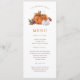 Este lindo e elegante cardápio de jantar de Ação de Graças do outono apresenta belas flores de aquarela, abóboras laranja queimada e branca e um padrão de xadrez búfalo laranja e branco no verso.