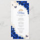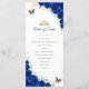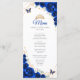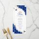 Celebração da Quinceanera azul, dourada e branca, finos programa de dupla face e cartão de menu. Recursos, fontes de script, borboletas douradas, rosas de aquarela e tiara. Perfeito para uma elegante celebração de glam estilo princesa. Personalize com seus próprios detalhes.