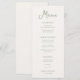 Este simples e na moda, creme de marfim e cartões de cardápio verde de sábio apresentam tipografia de script de estilo vintage. Adicione suas opções de janto para iniciantes ou aperitivos, primeiro curso, prato principal ou entrada e sobremesas. Um olhar elegante e clássico minimalista que ainda é único e contemporâneo e é perfeito para a sua recepção de casamento ou janto de ensaio, ou para as ofertas de comidas de chás de panela ou casais.