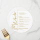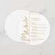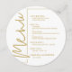Um cardápio de jantar branco redondo apresenta suas opções de menu em letras douradas chiques, perfeito para um casamento moderno, jantar de ensaio de casamento, festa de aniversário ou qualquer evento especial com jantar sentado. Personalize facilmente com o seu cardápio e detalhes. MAIS cores em nossa loja.