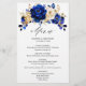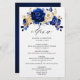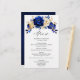 Elegante menu de casamento do tema ouro azul real, com elegante buquê de azul real, Marinho, ouro, flores amarelas do rosa e folhas de eucalipto. Entre em contato comigo para obter ajuda sobre a personalização ou se você precisar de outro produto com este design.