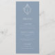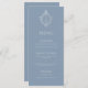 Um menu elegante com ar vintage, recomendado para um casamento com cor azul empoeirada de casamento. Acima do texto, há um monograma em uma crista de folha prateada suja vintage. O título "Menu" e as legendas são escritas em bonés. Todo texto pode ser personalizado e tem uma cor de cinza semelhante à crista de prata falsa. O fundo é azul empoeirado. No verso, há o mesmo monograma em crista. O monograma é formado por duas iniciais separadas por uma fina linha. A crista floral vintage é de uma antiga ligação ao cobrir, do livro "Rust, Smut Mildew & Mold", de 1870, agora no dominio público.