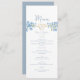 Escrito elegante e moderno de caligrafia, elegante cardápio azul de casamento com corda dourada, flores silvestres periwinkle, monograma e simples escrita de caligrafia.