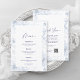 Este elegante cartão de casamento de dois lados apresenta uma fronteira floral azul e suave e poética de eternos. A frente mostra um obrigado sincero que você envia, juntamente com um código QR para os convidados verem e compartilharem fotos do grande dia. Pelo contrário, um menu bem organizado orienta os seus convidados através da experiência culinária da noite. Perfeito para casamentos românticos, jardins ou clássicos que buscam um toque pessoal e moderno.