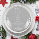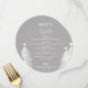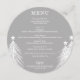 Um cardápio de jantar redondo prateado elegante com árvores de Natal brancas apresenta os detalhes do seu cardápio em letras sofisticadas. Perfeito para uma festa de Natal ou qualquer evento especial com jantar sentado.