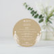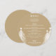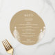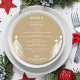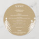 Um cardápio de jantar redondo em dourado suave com árvores de Natal brancas e os detalhes do seu cardápio em letras elegantes. Perfeito para uma festa de Natal durante as festas de fim de ano ou qualquer evento especial com jantar sentado.