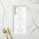 Este único design botânico apresenta um galho curvante de folhas elegantes de eucalipto com cor d'água com folhas artísticas de prata esboçadas e flores brancas silvestres.