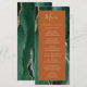 Este elegante cardápio moderno de casamento apresenta uma cor verde esmeralda de água. O texto personalizável combina um script de manuscrito branco de cor dourada com fontes itálicas e em prato em um fundo laranja ou ferrugem queimado. O verso apresenta um design emerald verde e dourado.