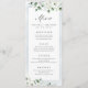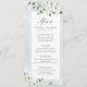 Moldura branca de cor aquática moderna, verde floral de eucalipto e moldura de cor dourada em fundo azul empoeirado, com guião de menu de tendências, elegante e na moda, menus de casamento de excelente para casamento rústico, casamento botânico e casamento de praia em primavera e verão. Ver todas as peças correspondentes na coleção
