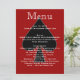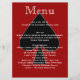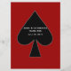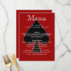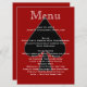 Menu temático da recepção de casamento do cartão de jogo do divertimento. Os gráficos de um símbolo preto grande das pás decoram a obscuridade - fundo vermelho, com o texto branco feito sob encomenda pronto para personalizar para seu casamento. Excelente lunático do menu do casamento para Alice no país das maravilhas, no tema de jogo, e nos casamentos de Vegas demasiado.