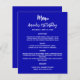 Um fundo azul real. Texto branco. Frente: personalize e adicione seu nome, data e menu. 1 folha = 1 menu impresso borda a borda.