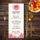 Um cartão de menu com rosas de aquarela no topo e no fundo e seus detalhes em caracteres quicos, perfeito para sua festa Derby ou qualquer evento especial. CORRESPONDENTE a itens na nossa coleção.