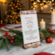 This festive Christmas menu is framed with lush seasonal botanicals—poinsettias, pinecones, holly berries, and evergreen sprigs—creating a warm, elegant border that evokes holiday cheer. The layout is neatly divided into four sections, each spaced for clarity and visual balance. Decorative flourishes and classic serif fonts lend a traditional, celebratory feel, while the rich reds and greens reinforce the cozy, wintry theme. The overall design invites guests to savor a thoughtfully curated feast, blending rustic charm with refined presentation.