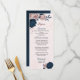 belas rosa poeirentas, flores azuis marinhos e elegantes cardápio de casamento botânico. Parte de trás do cartão: lírios rosa elegantes num fundo azul marinho Os detalhes da brilha são simulados