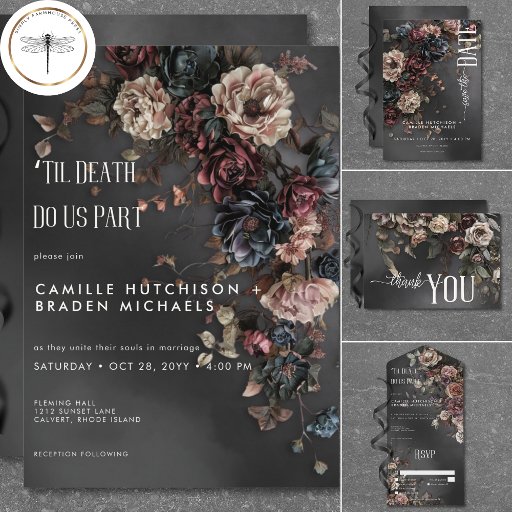 Desvendar a elegância do seu romance gótico com o nosso belo cardápio de casamento. Adorados com fontes solenes de flores desbotadas contra fundo preto macio, cada uma está envolta em um delicado véu de névoa, definindo o tom perfeito para seu amor eterno. Faça seu dia especial inesquecível com esses designs singularmente encantadores. Deixe sua história de amor se desenrolar em um esplendor gótico sem igual. Criado pela imprensa simplesmente de farmácia.