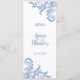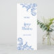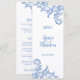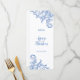 © 2018 Socialite Design Inc. Lindos giros de canto e flores, pintados manualmente com a cor azul-real suave, cartões de menu que complementam a coleção de casamento correspondente.