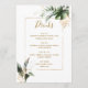 Este menu de bares de casamento apresenta folhagem tropical verde-aquarela, monstera, folhas de palmeiras, folhas de bananeiras e folhas de ouro falso com uma falso estrutura de retângulo dourado. É perfeito para um casamento tropical, praia ou destino.