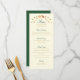O romance do outono é capturado neste cardápio de casamento. Folhas caídas em cascata no cartão, em uma torrente de vermelhos, laranjas e dourados contra um fundo creme. As folhas de carvalho e de carvalho são destacadas. Um verde florestal profundo adiciona contraste ao fundo e dispara um monograma personalizável. A queda está no ar com este menu elegante.