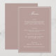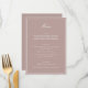 This formal wedding menu card features an elegant script heading, clean serif typography, and a classic border on a mauve background for a timeless reception look. The structured layout presents each course clearly while adding a refined, cohesive touch to table settings or place settings. Designed to coordinate seamlessly with classic and black-tie wedding stationery, it elevates the overall tablescape without feeling busy. Ideal for couples who want reception details that feel polished, organized, and enduring.