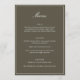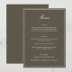 This formal wedding menu card features an elegant script heading, clean serif typography, and a classic border on an olive background for a timeless reception look. The structured layout presents each course clearly while adding a refined, cohesive touch to table settings or place settings. Designed to coordinate seamlessly with classic and black-tie wedding stationery, it elevates the overall tablescape without feeling busy. Ideal for couples who want reception details that feel polished, organized, and enduring.