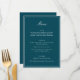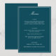 This formal wedding menu card features an elegant script heading, clean serif typography, and a classic border on a deep teal background for a timeless reception look. The structured layout presents each course clearly while adding a refined, cohesive touch to table settings or place settings. Designed to coordinate seamlessly with classic and black-tie wedding stationery, it elevates the overall tablescape without feeling busy. Ideal for couples who want reception details that feel polished, organized, and enduring.