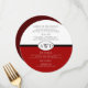 Modelo de cardápio de casamento vermelho, preto e branco, redondo (ou quadrado) monograma. Adicione três iniciais ao centro sobre uma linha central preta que divide o menu ao meio. Personalizar quatro seções para aperitivos/hor d'appvres, salada, entradas e sobremesa. Menus redondos ajustado em cima de placas. O reverso é o padrão vermelho e preto. (Isso é impresso em um convite redondo que oferece atualizações e também vem com envelopes brancos.)