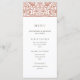 Estes bonitos cartões de cardápio de casamento apresentam uma elegante cor damasco rosa de ouro brilhante em um fundo branco. Observe que a cor damasco dourada rosa está impressa digitalmente e não é realmente brilhante.