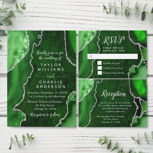 Create a striking presentation with this green and silver agate marble menu, perfect for wedding receptions and versatile enough for stylish multi-purpose use. Deep emerald tones, organic stone-inspired textures, and shimmering silver accents come together to create a refined yet dramatic look that pairs beautifully with fall or winter celebrations. Designed to complement elegant, modern, and glamorous events, this agate-inspired menu can be customized for wedding dinners, cocktail hours, dessert tables, or upscale event and restaurant menus, offering timeless sophistication that extends well beyond the wedding day.