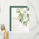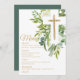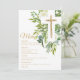 Greenery Floral Botanical Cross Elegant Baptism Menu apresenta uma cruz branca sobre folhas de eucalipto pintadas a verde e verde com as informações do menu abaixo. Personalize editando o texto nas caixas de texto fornecidas. Elaborado por ©2022 Evco Studio www.zazzle.com/store/evcostudio