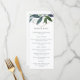Este cartão de menu de casamento moderno e elegante apresenta uma forma geométrica em rosa dourado falso rodeada por belos ramos de verde.