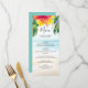O cardápio de casamento da ilha tropical apresenta um fundo de paisagem da praia de abstrato com uma borda de palmeiras de aquarelas e uma flor de hibisco. O verso é verde-marinho/azul-aqua. Perfeito para destino, praia e temas costeiros. Trabalho de arte por KL Stock.