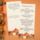 Fundo colorido creme decorado com flores de queda laranja e abóboras. Personalize e adicione o menu Ação de Graças à frente. Voltar: Espaço para você adicionar uma mensagem de agradecimento ao seu convidado. E uma seção para os hóspedes partilharem as suas atitudes.
