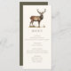 Cartão de menu de jantar com tema de caça com ilustração de cervo e tipografia elegante, fundo verde oliva escuro e texto personalizado. Perfeito para um jantar no campo, jantar de ensaio de casamento elegante, jantar de caça, festa de aposentadoria de caça ou celebração de aniversário de caça.