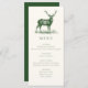 Cartão de menu de jantar verde com tema de caça com ilustração de veado e tipografia elegante, suporte verde correspondente e texto personalizado. Perfeito para um jantar campestre, jantar de ensaio de casamento elegante, jantar de caça, festa de aposentadoria de caça ou festa de aniversário de caça.