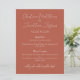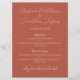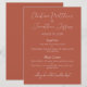 Este menu de evento ou de casamento moderno e elegante tem um fundo terracota. Os nomes dos noivos são impressos numa fonte cursiva. Você pode personalizar os itens do cardápio com as suas opções de comida.