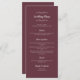 O cardápio de casamento tradicional elegante apresenta um design clássico romântico. Duas decorações florescem cada uma contendo um coração solteiro maravilhosamente ao redor do título "Menu Casamento". Personalize todos os detalhes em delicadas letras brancas e nítidas e roteiros em um fundo tradicional de burgundy. A parte traseira é terminada na cor sólida correspondente. O acabamento sem bordas permite que você escolha facilmente sua forma de papel favorita, se aplicável à aparência final. Para obter resultados ótimos, substitua os detalhes do modelo com seus próprios detalhes, deixando espaço entre os parágrafos como no exemplo e capitalizando onde especificado ou se a palavra for um nome adequado e normalmente capitalizado. Se você precisar de assistência com espaçamento para tornar seus detalhes perfeitamente ajustados, por favor, envie-me uma mensagem no link fornecido na lista ou envie um e-mail para invitationsuites@gmail.com. Normalmente respondo dentro de 24 horas ou menos. Solicitação de cor personalizada aceita.