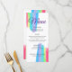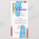 Belo menu janto de casamento de cor d'água do arco-íris com traçados bonito e artísticos de cor brilhante para um evento LGBTQ. O elegante guião roxo cursivo dá um bonito pop de cor ao menu de comida de recepção clássico. Adicione suas opções de início, curso principal e sobremesa e personalize com seu nome e data de casamento na parte inferior. Detalhe os aperitivos e as entradas para seus convidados de recepção.