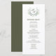 Aumente sua recepção de casamento com este cartão de cardápio de casamento, com caligrafia elegante simples e uma noiva refinada e um monograma nobre. Projetado em na moda verde-oliva, este janto de recepção modelo mostra um motif clássico de louros de coroa com delicada folhagem de folhas verdes, acrescentando um toque natural e eterno à sua mesa de ensaio. A design de tipografia tradicional e as iniciais de ampersor clássico criam um aspecto sofisticado e personalizado. Perfeito para uma elegante celebração de casamento