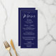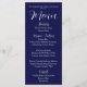 Simples estilo, cartão de menu de cor azul marinho jantado para o seu casamento, que apresenta um script branco e estilizado juntamente com as suas informações personalizadas. Edite o cartão de menu e substitua os nomes de casamento e a data juntamente com os itens de menu que serão servidos na sua recepção de casamento. Selecione o estilo do cartão de menu conforme desejado.