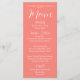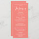 Simples estilo, cartão de menu de cor de coral para o seu casamento, que apresenta um guião branco e estilizado juntamente com as suas informações personalizadas. Edite o cartão de menu e substitua os nomes de casamento e a data juntamente com os itens de menu que serão servidos na sua recepção de casamento. Selecione o estilo do cartão de menu conforme desejado.