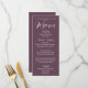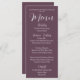 Simples estilo, cartão de menu de janto de cor de berinjela para o seu casamento, que apresenta um roteiro branco e estilizado juntamente com as suas informações personalizadas. Edite o cartão de menu e substitua os nomes de casamento e a data juntamente com os itens de menu que serão servidos na sua recepção de casamento. Selecione o estilo do cartão de menu conforme desejado.