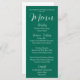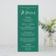 Estilo simples, cartão de menu verde esmeralda para o seu casamento, que apresenta um guião branco e estilizado juntamente com as suas informações personalizadas. O lado inverso do menu é branco. Edite o cartão de menu e substitua os nomes de casamento e a data juntamente com os itens de menu que serão servidos na sua recepção de casamento. Selecione o estilo do cartão de menu conforme desejado.