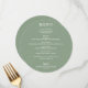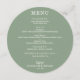 Um cartão de menu redondo jantado em verde-sábio (ou qualquer cor) e a letra chic em branco mostra as opções de menu. Perfeito para uma recepção de casamento moderna, janto de ensaio de casamento, festa de aniversário ou qualquer evento especial com um janto sentado. Escolha QUALQUER FUNDO DE COR, qualquer texto de COR, qualquer letra! Personalize facilmente com o menu e os detalhes do seu janto.