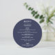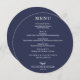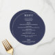 Uma placa de menu redonda janta em azul-safira (ou qualquer cor) e a inscrição em branco no chic mostra as suas opções de menu. Perfeito para uma recepção de casamento moderna, janto de ensaio de casamento, festa de aniversário ou qualquer evento especial com um janto sentado. Escolha QUALQUER FUNDO DE COR, qualquer texto de COR, qualquer letra! Personalize facilmente com o menu e os detalhes do seu janto.