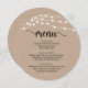 Moderno Rustic Brown Kraft, Luzes de Corda, Formas de Placa Redonda, Janto de elopemento de Casamento, Menu Brunch e Lunch. Um cartão de menu perfeito para o seu grande dia. Você pode alterar as cores da fonte do script e alterar o conteúdo e as fontes do menu para atender às suas necessidades.