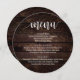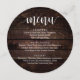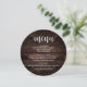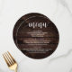 Madeira castanha escura, em forma de prato redondo, Janto de elopemento de casamento. Um menu de bar perfeito para o seu grande dia. Você pode alterar as cores da fonte do script e alterar o conteúdo e as fontes do menu para atender às suas necessidades.